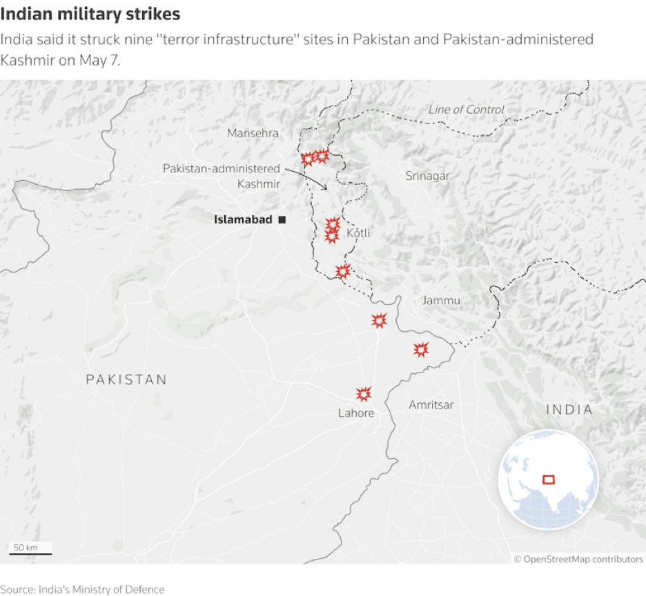 - Pakistan said 26 people were killed and 46 others were injured in strikes on six sites as well as firing along the Line of Control that divides the Indian- and Pakistan-controlled areas of Kashmir. India said it hit nine locations across the Pakistani province of Punjab and in Pakistan-administered Kashmir.