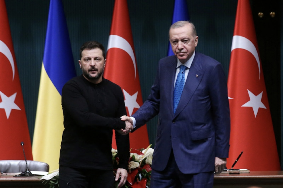 Ukrainian President Volodymyr Zelensky challenged Russian president Putin for face to face talks for ending the war in Ukraine . He is shown here with Turkish president Erdogan in Ankara