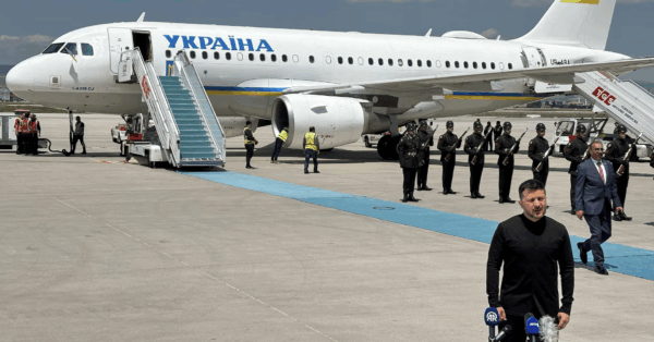 Ukrainian President Volodymyr Zelensky talks to the media upon his arrival at Esenboga Airport in Ankara, Turkey, May 15, 2025. REUTERS/Huseyin Hayatsever