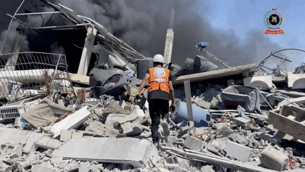 A rescuer walks over rubble to assess damage and look for survivors, in Khan Younis, Gaza, May 23, 2025, in this screengrab taken from video. Palestinian Civil Defence/Handout via REUTERS