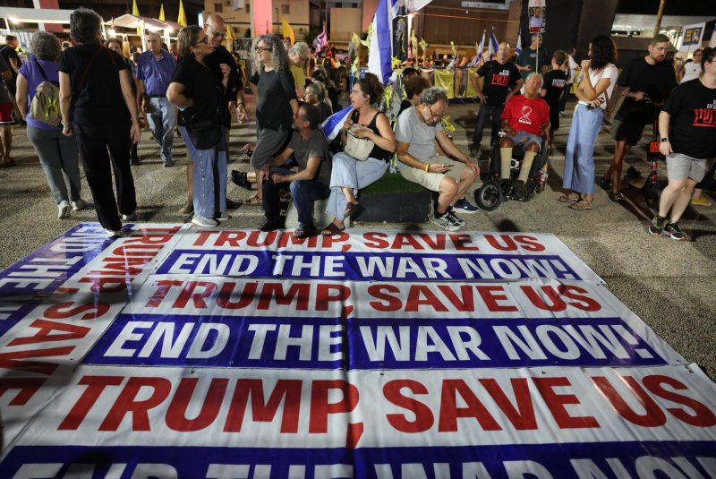 Supporters of families of Israeli hostages held by Hamas in Gaza participate in a protest Saturday in Tel Aviv, calling to stop the war and for the release of the hostages. The Israeli army to prepare for the implementation of a U.S. peace pla. Photo by abir Sultan/EPA/ABIR SULTAN