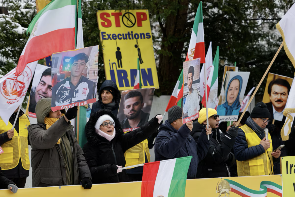 Supporters of the Iranian opposition group, the National Council of Resistance of Iran, protest to demand an immediate stop to the violence against protesters in Iran and an end to detentions and repression, in Berlin, Germany, January 3, 2026. REUTERS/Axel Schmidt