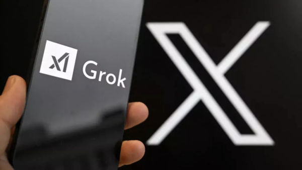 This photograph shows a smartphone bearing the logo of Grok, a generative artificial intelligence chatbot developed by US artificial intelligence company xAI in front of the X (formerly Twitter) logo in Brussels on January 12, 2026. © Nicolas Tucat, AFP