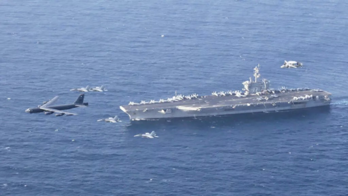 The USS Abraham Lincoln carrier and a US Air Force B-52H Stratofortress, conduct joint exercises in the US Central Command area of responsibility in the Arabian Sea on June 1, 2019. © Brian M. Wilbur, US Navy via AP