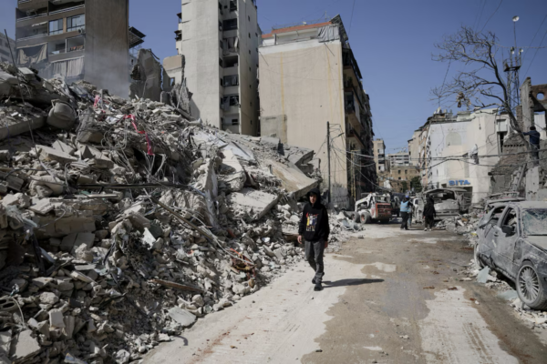 PHOTO- A person walks past debris at the site of an Israeli strike, following an escalation between Hezbollah and Israel amid the U.S.-Israeli conflict with Iran, Zuqaq al-Blat district in central Beirut, Lebanon, March 18, 2026. REUTERS/Khalil Ashawi