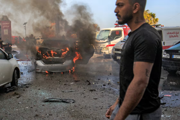 Photo –A man walks near a burning vehicle that was targeted by Israeli bombardment in Lebanon’s southern coastal city of Sidon today.