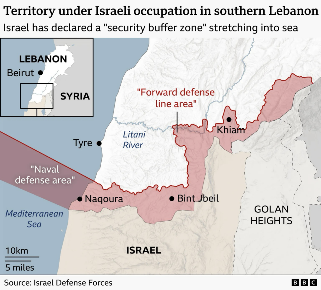 The IDF has published a map showing what it calls a “forward defence area” where it is seeking to maintain control. It says it aims to stop Hezbollah firing anti-tank missiles at northern Israel and stop its operatives from attempting any cross-border raids.