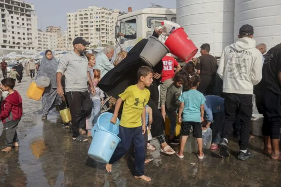 Displaced Palestinians fill water containers in Gaza City (Image: Getty)