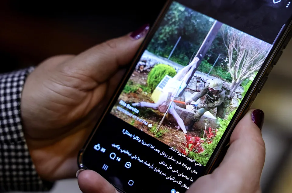A woman checks a social media post on her mobile phone featuring an image that appears to show an Israeli soldier hitting a statue of Jesus Christ in the southern Lebanese Christian village of Debl. April 20, 2026. / Credit: Getty