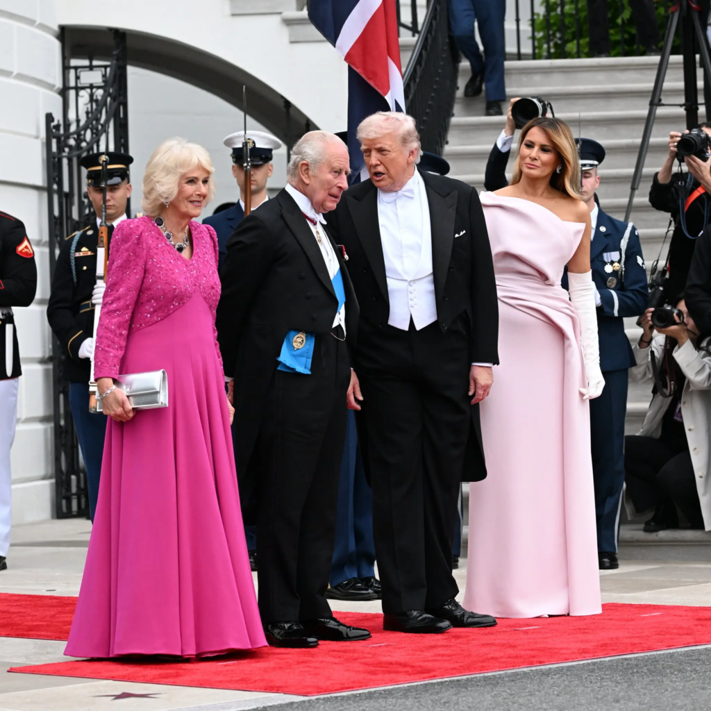 The state dinner honoring Charles and Camilla is set to begin shortly. Melania Trump, the first lady, is wearing a custom-made strapless delphinium pink Dior gown (along with white opera gloves), a nice moment of parallelism to the light pink Dior coatdress the queen wore at her arrival in the United States on Monday. Delphiniums are famously one of Charles’s favorite flowers.